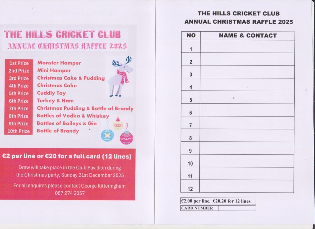 The annual Christmas Raffle is taking place at the Santa Party in the Clubhouse on Sunday, 21st December. Draw cards and details are below.
